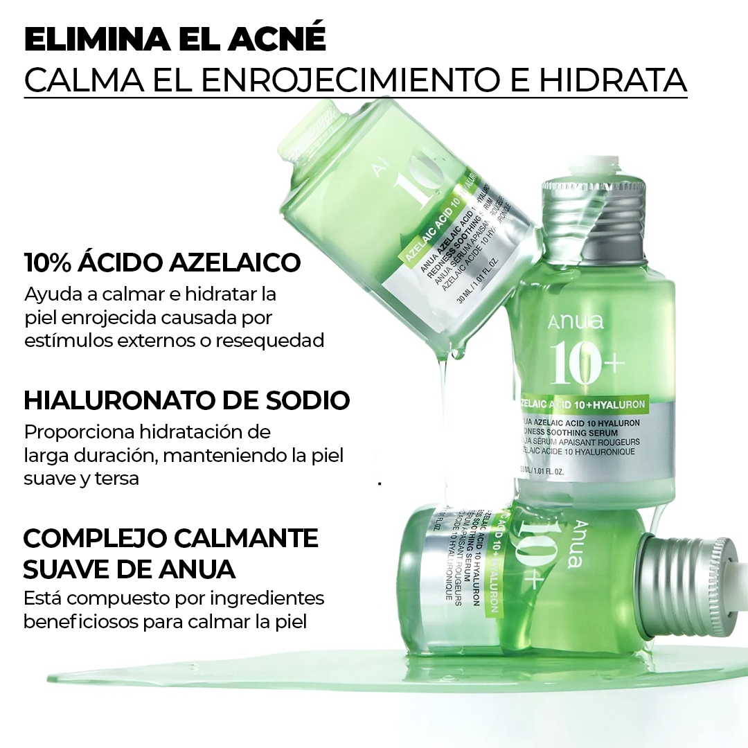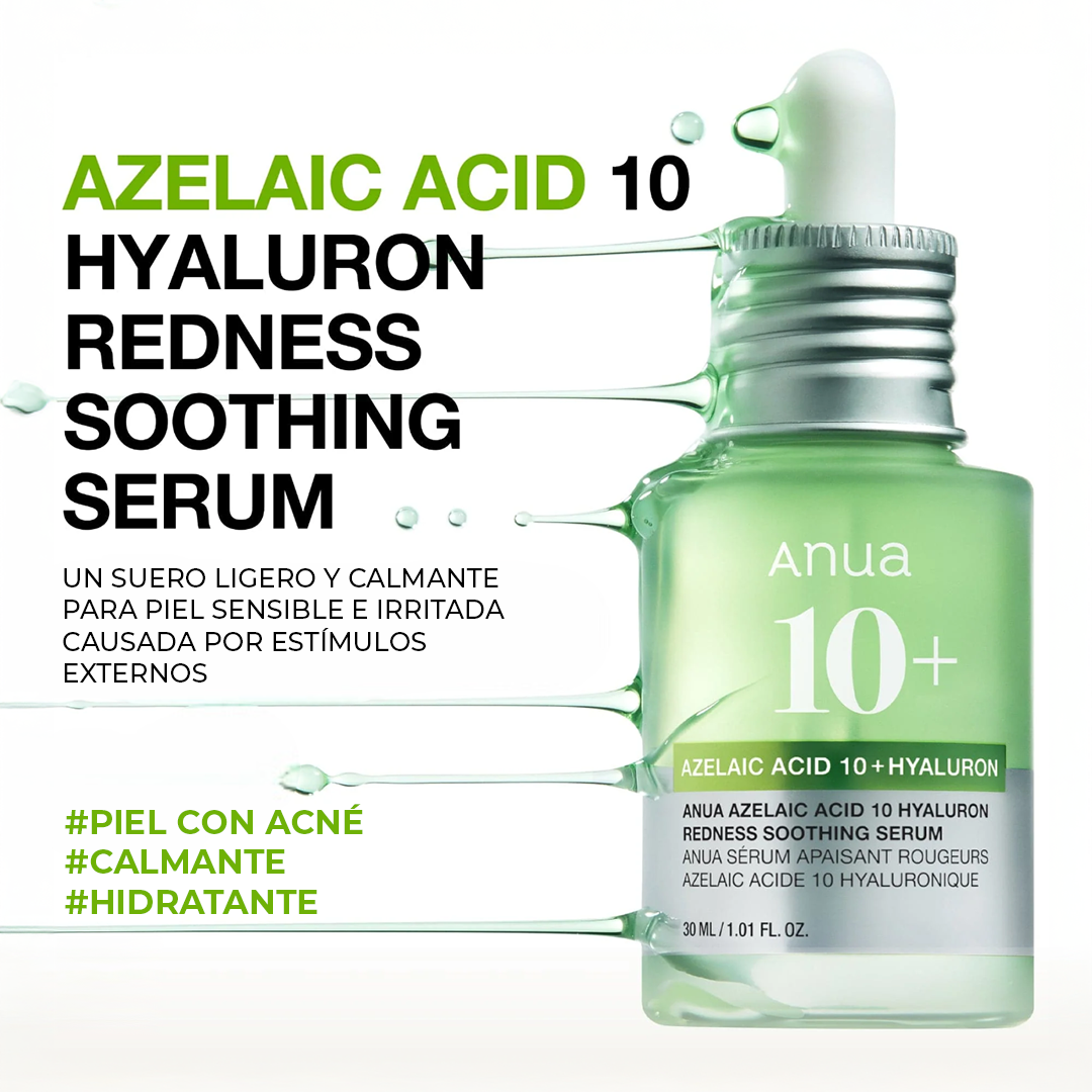 Anua Azelaic Acid 10 + Hyaluron es un suero formulado con 10% de ácido azelaico y ácido hialurónico, diseñado para calmar, unificar el tono y mejorar la apariencia de imperfecciones mientras mantiene la piel hidratada.