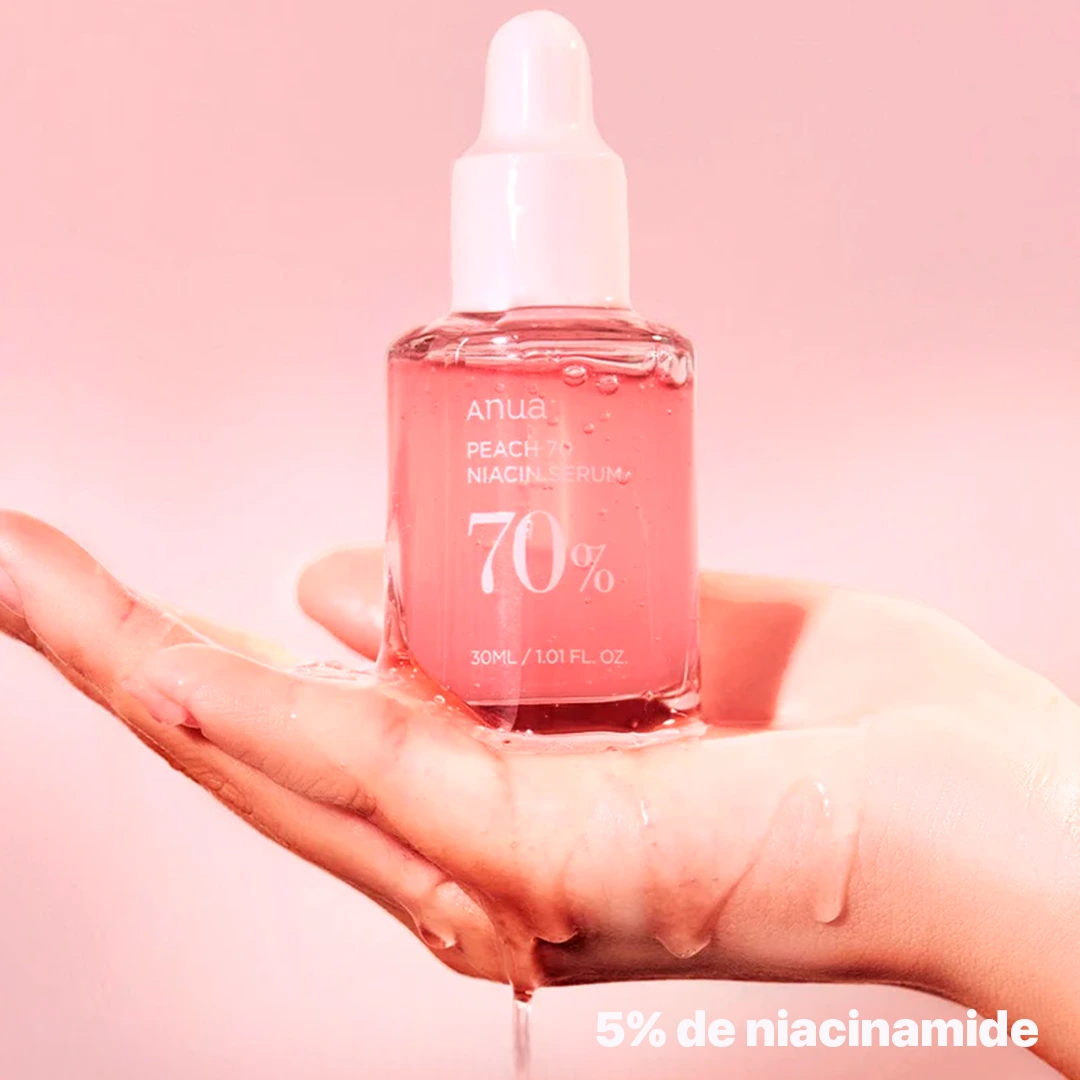 Serum Peach 70% Niacinamide 30 ml ANUA es un suero para piel luminosa enriquecido con melocotón y niacinamida, diseñado para revelar una piel radiante y cristalina. Ayuda a eliminar manchas del rostro y tratar brotes de acné