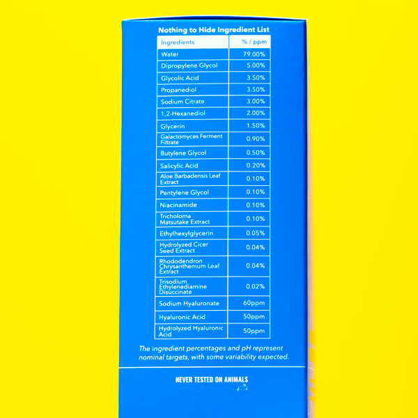Agua – 79,0 % Dipropilenglicol – 5,0 % Ácido glicólico – 3,5 % Propanediol – 3,5 % Citrato de sodio – 3,0 % 1,2 – Hexanediol – 2,0 % Glicerina – 1,5 % Filtrado de fermento de Galactomyces – 0,9 % Butilenglicol – 0,5 % Ácido salicílico – 0,2 % Extracto de hoja de aloe barbadensis – 0,1 % Pentilenglicol – 0,1 % Niacinamida – 0,1 % Extracto de tricholoma matsutake – 0,1 % Etilhexilglicerina – 0,05 % Extracto de semilla de cicer hidrolizada – 0,04 % Extracto de hoja de crisantemo rododendro – 0,04 % Disuccinato de etilendiamina trisódica – 0,02 % Hialuronato de sodio Ácido Hialurónico 60 ppm – Ácido Hialurónico Hidrolizado 50 ppm – 50 ppm