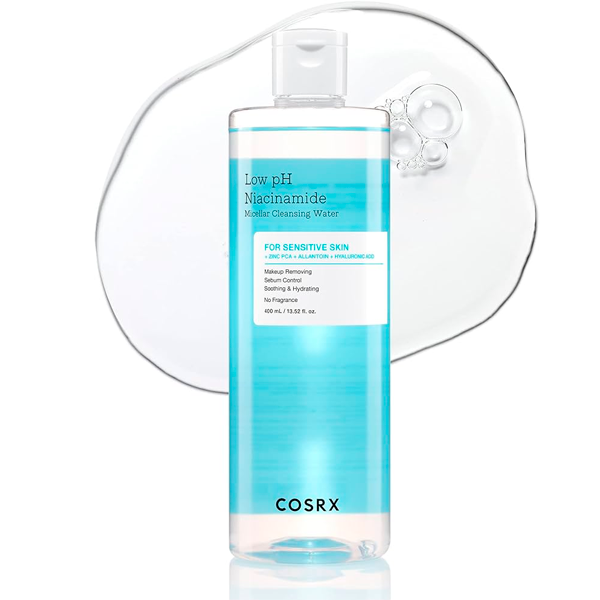 Agua Micelar de Niacinamide Cosrx todo en 1 de un paso: Limpiador micelar calmante e hidratante que elimina el maquillaje sin irritación, dejando tu piel húmeda y fresca sin ningún residuo de maquillaje. Limpiador clínicamente verificado: agua limpiadora no irritante clínicamente probada con el pH ideal para una piel sana e hidratada. Ingredientes clave: Formulada con niacinamida y zinc PCA, esta agua limpiadora micelar ayuda a controlar la piel grasa y problemática y protege la piel de las bacterias que causan acné. Modo de empleo: Remoje una almohadilla de algodón con agua limpiadora micelar de niacinamida de pH bajo y limpie suavemente las áreas con maquillaje. Limpiar lentamente para eliminar todos los residuos de maquillaje e impurezas. No frote la piel. Repita si es necesario. Sin fragancia y especialmente desarrollada para pieles sensibles: esta agua limpiadora micelar está libre de productos químicos agresivos y contiene potentes ingredientes calmantes para la piel, como un madecassósido y alatoína, perfecto para aquellos con piel sensible.