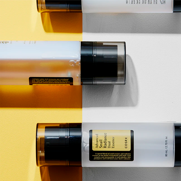 Ambas esencias están contenidas de manera separada y se distribuyen equitativamente gracias al dispensador. Tipos de mucina de caracol en esta esencia: Terrestre: Retiene la hidratación en tu piel y suaviza la textura áspera. Negra: Ayuda a disminuir la apariencia de poros abiertos y tiene un efecto antioxidante. Caparazón dorado: Bloquea los dañinos rayos UV. Contiene 80 ml