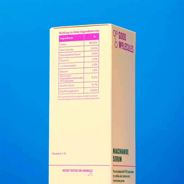 Minimiza el aspecto de los poros y el tono y la textura desiguales con este suero de 10% niacinamida. Promueve una piel suave y uniforme y minimiza la aparición de poros con Niacinamide Good Molecules. Formulado con un 10% de niacinamida (vitamina B3), este suero liviano ayuda a refinar el tono y la textura de la piel para un cutis más brillante y de aspecto más saludable.